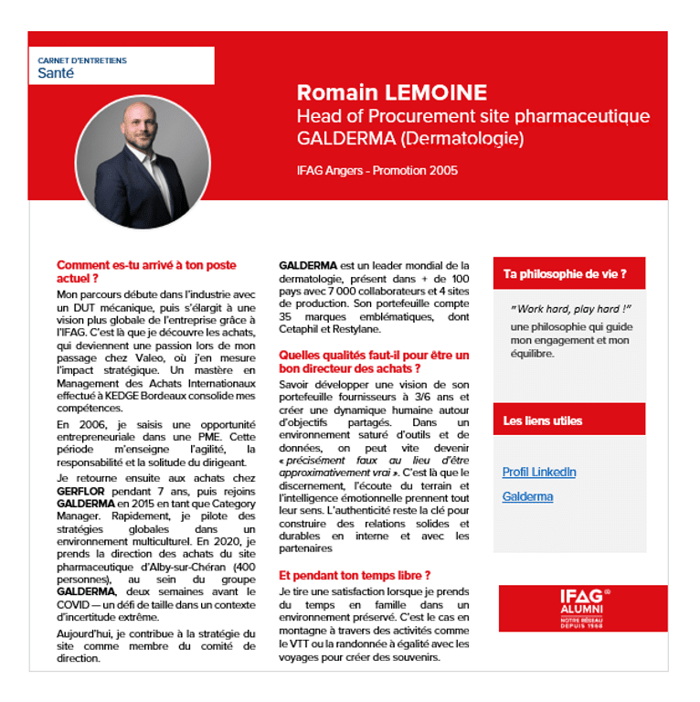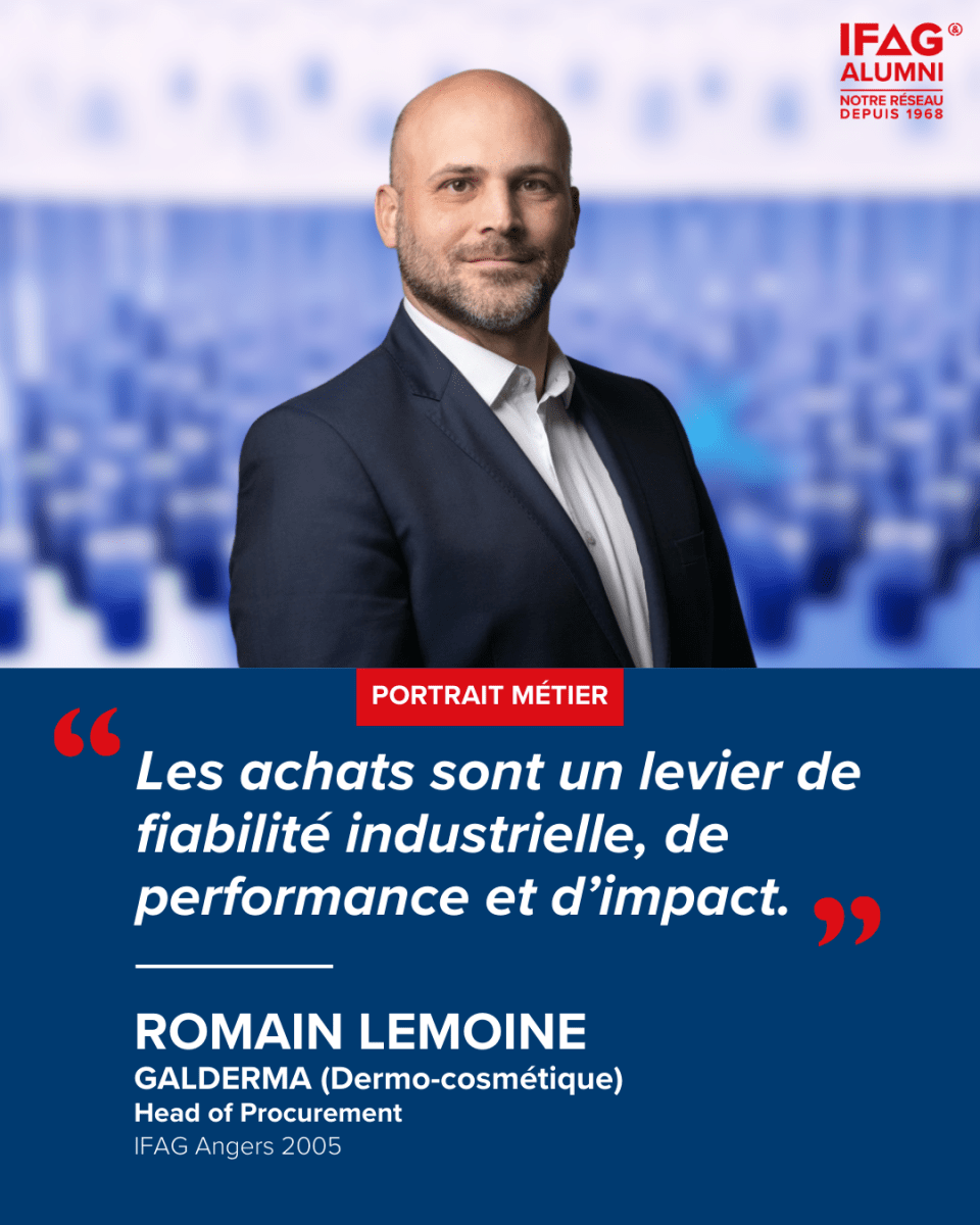 [PORTRAIT MÉTIER] "Les achats sont un levier de fiabilité industrielle, de performance et d'impact" selon Romain LEMOINE (IFAG Angers 2005) Head of Procurement chez Galderma