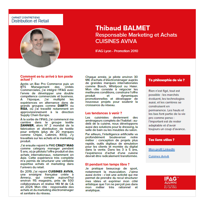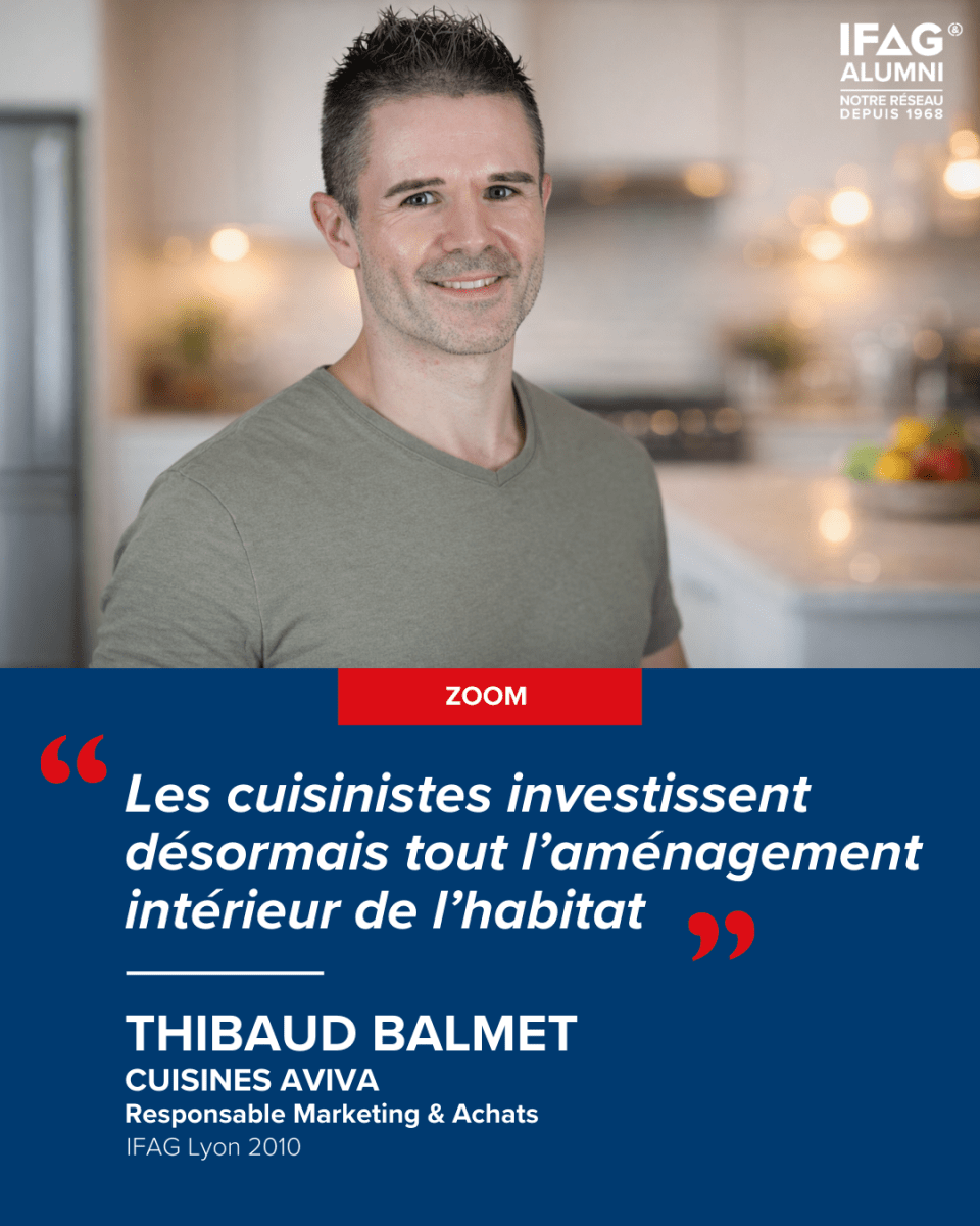 [PORTRAIT MÉTIER] Le métier de cuisiniste est-il en train de changer de nature ? Selon Challenges (12/02/2026), les ventes de cuisines ont progressé de +5,6 % en 2025. Derrière cette reprise se cache une transformation : les cuisinistes deviennent progressivement des aménageurs complets du logement. Une évolution que vit Thibaud BALMET (IFAG Lyon 2010), responsable des achats électroménager et du marketing de l’offre chez Cuisines AvivA, réseau de 115 magasins franchisés et 150 M€ de CA en 2024.