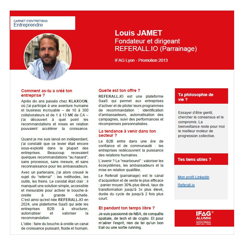 [ZOOM] 💥 Le bouche-à-oreille 2.0 : et si c’était le prochain canal roi du business ? 💡 Le levier le plus puissant… et le plus sous-exploité Dans un monde saturé de messages froids et impersonnels, la confiance redevient la monnaie la plus rare. Et pourtant, moins de 10 % des entreprises exploitent vraiment le referral — ce “bouche-à-oreille digital” capable de générer jusqu’à 30 % du chiffre d’affaires à coût maîtrisé. " On croit tous faire de la recommandation, mais la réalité, c’est qu’on exploite à peine 1 % du potentiel ", explique Louis Jamet (IFAG Lyon 2013), cofondateur de Referall.io. À l’heure où les boîtes se battent sur Google Ads et LinkedIn, le vrai pouvoir est souvent… dans le carnet d’adresses de leurs clients. ⚙️ Digitaliser la confiance sans la dénaturer Referall.io ne remplace pas la relation humaine, il la renforce. "Notre conviction : la technologie doit être au service de la confiance, pas l’inverse." En un clic, un client peut recommander sans effort, suivre l’avancement et être remercié. Les équipes, elles, gagnent en visibilité et en temps. Et grâce à la data, les campagnes se déclenchent au moment parfait — par exemple après un avis Google 5 étoiles. C’est une mécanique simple, mesurable et fluide : du lien humain, amplifié par la tech. 📈 Le ROI qui fait réfléchir les directions commerciales Un client SaaS de 40 000 entreprises a mis en place le programme Referall.io en… 3 heures. Résultat ? 106 ambassadeurs, 83 recommandations, 15 deals signés et un ROI x15 dès la phase test. Pas de promesses, juste une méthode qui transforme l’intention en performance. "On ne digitalise pas la confiance, on la rend plus simple, plus juste et plus rentable." 🌍 Vers une ère du “Nearbound” Le marketing B2B entre dans une nouvelle ère : celle de la proximité. Les meilleurs leads ne viennent plus de la pub, mais de l’écosystème : clients, partenaires, communautés. "Les entreprises redécouvrent que la confiance est un actif business " conclut Louis. Demain, les directions commerciales les plus performantes ne seront pas celles qui prospectent le plus… mais celles qui activent le mieux la recommandation. 👉 Et toi, penses-tu que le bouche-à-oreille va redevenir le vrai moteur du business ? Dis-le-nous en commentaire 👇 #alumni #management #ecoledemanagement #b2b #referralmarketing #growth #entrepreneuriat #ifag PORTRAIT INTIME |