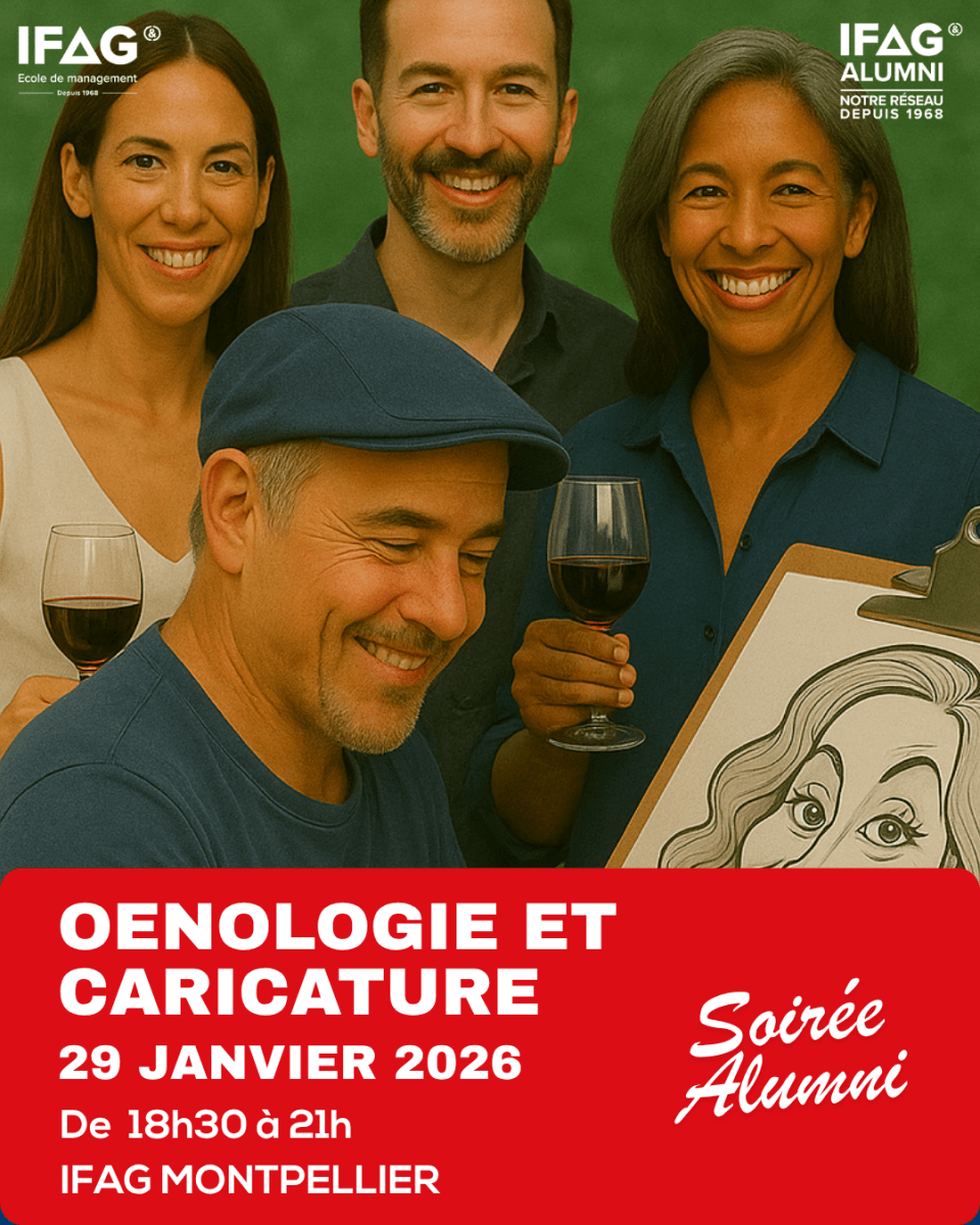 Œnologie & Caricature à l’IFAG Montpellier Le 29 janvier 2026 - 18h30/21h Nous avons le plaisir de vous inviter à une soirée Œnologie organisée au sein du campus IFAG Montpellier le jeudi 29 janvier 2026, de 18h30 à 21h00. Au programme